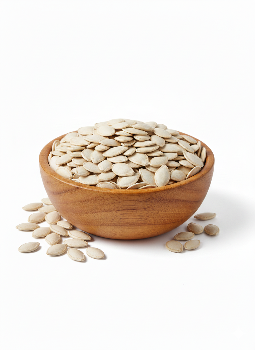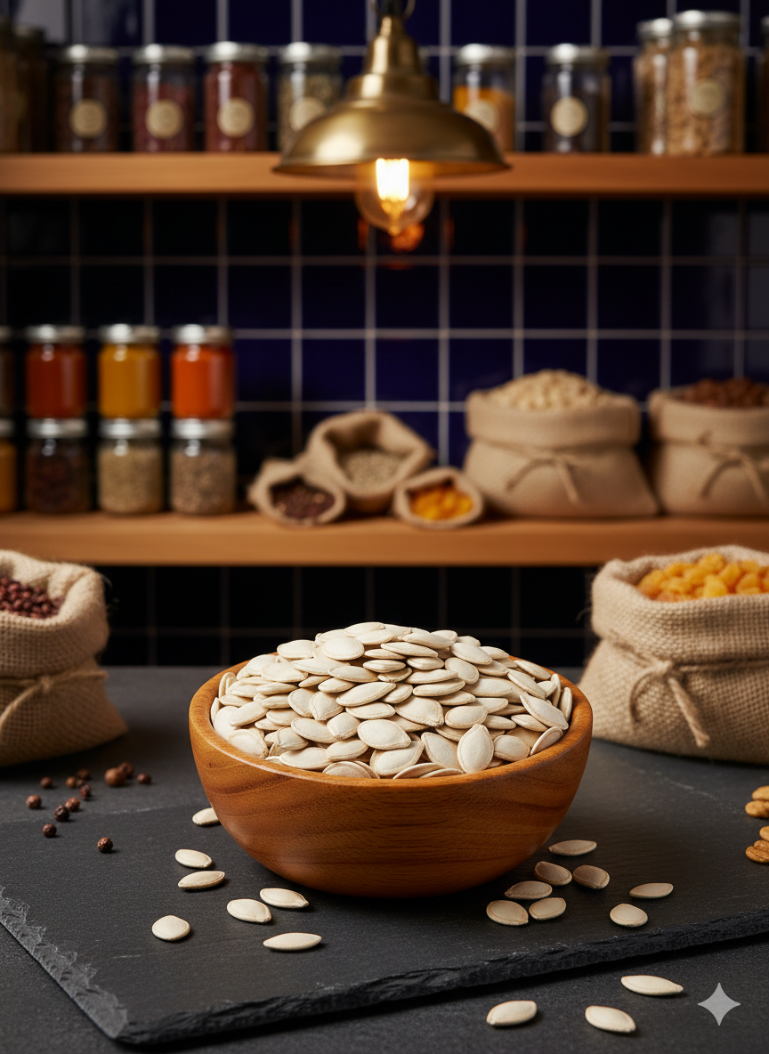 تخمه کدو سالم و مغذی، بو داده با رویکرد نمک دار با روکشهای طعمدار محدود. بافت ترد مناسب بهعنوان میانوعده روزانه، تزئین سالادها و افزودنی به دستورهای آشپزی.